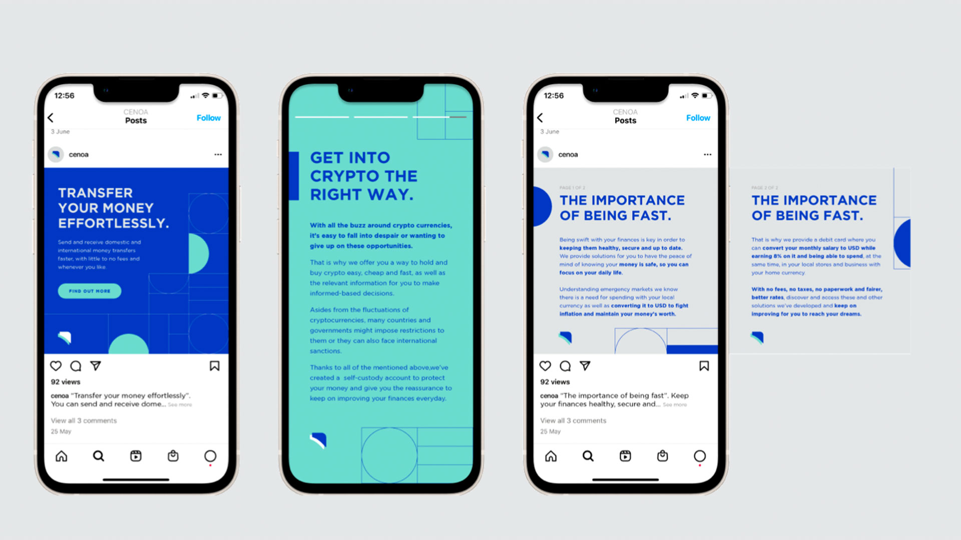 The first step was to develop the brand strategy and visual direction. We took inspiration from Mediterranean roots – colorful sea-inspired palette that is followed by their sail-shaped icon that represents their customers living their lives to the fullest. The content strategy, art direction, experience brought us to these, that we can identify Cenoa’s Brand Persona as that of The Hero. We want to leave a mark on the world, show mastery in what we do and set ourselves as leaders.